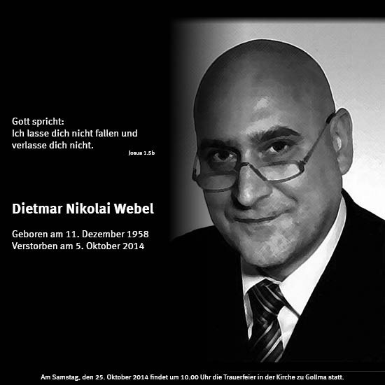 Die öffentliche Trauerfeier für Dietmar Nikolai Webel findet am Samstag, 25. Oktober 2014, in der Kirche von Gollma statt.